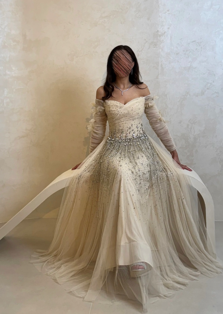 فستان سهرة أنيق بتصميم أنثوي ناعم يجمع بين الرقي والفخامة، يتميز بقصة صدر منسدلة مزينة بتطريزات لامعة تضيف لمسة فاخرة، مع خصر محدد يبرز القوام بانسيابية. تنسدل التنورة بقماش واسع مزين بنقاط لامعة تمنح الفستان حضورًا جذابًا في الإطلالات المسائية، ويكتمل التصميم بأكمام أوف شولدر طويلة مزينة بطبقات ناعمة تعكس ذوقًا راقيًا ومميزًا.