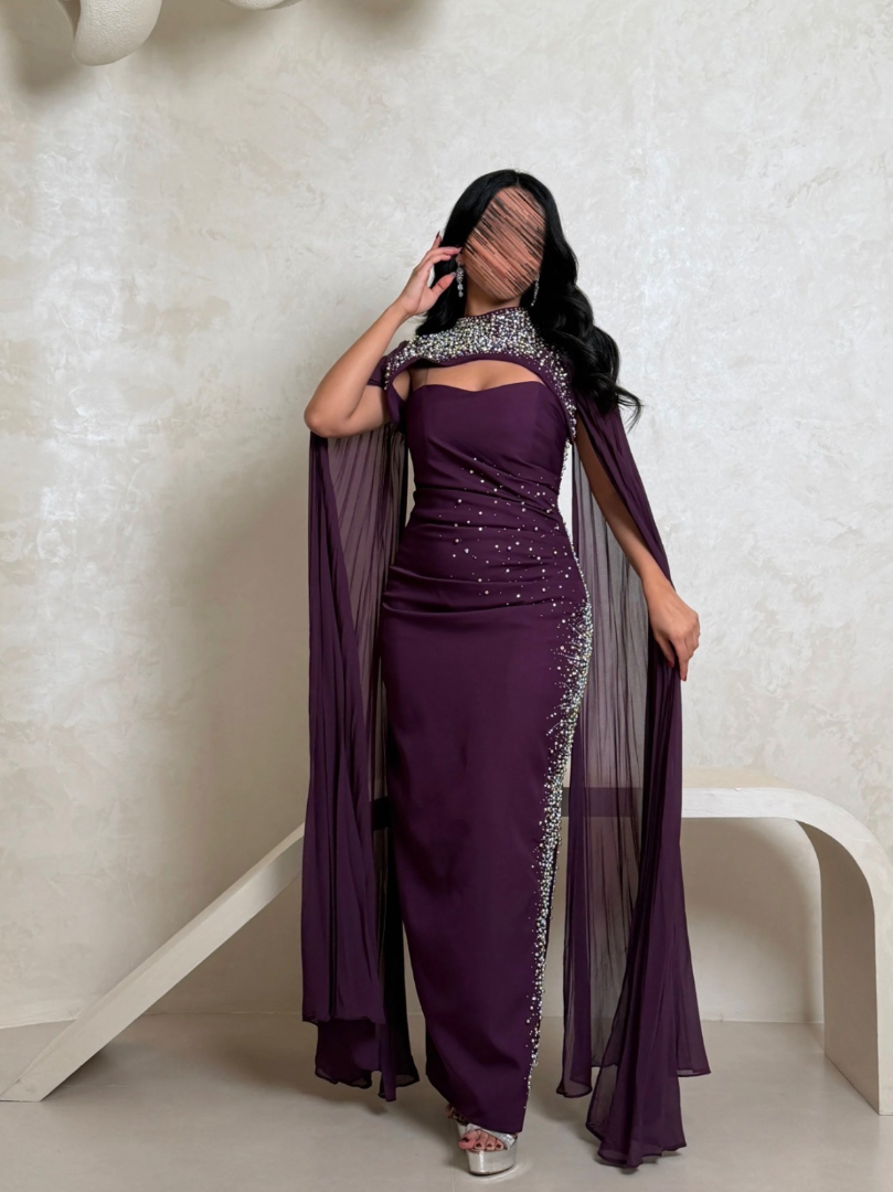 فستان سهرة بتصميم أنيق يجمع بين الفخامة والرقي، يتميز بقصة مستقيمة تبرز جمال القوام مع تفاصيل كريستالية ناعمة تضيف لمسة لامعة راقية. يأتي مع كمين منفصلة من الشيفون تضيف حركة وانسيابية فاخرة، ليمنحك إطلالة لافتة ومثالية للمناسبات المسائية الخاصة.